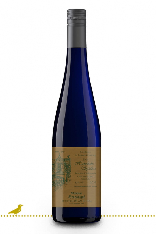 Die Huxelrebe ist eine Rebe die ausschließlich in Deutschland beheimatet ist. Namensgebend war Fritz Huxel, der die Trauben, welch aus Kreuzung aus Elbling und Muscat précoce de Saumur entstanden, als Erster großflächig anbaute. Die Trauben der Huxelrebe können sehr hochwertige Weine hervorbringen. Ihre breiten, teils intensiven Fruchtnoten, eingerahmt von feinen Muskataromen bilden die Grundlage für unsere beliebte säurearme Drosselhof Spätlese.